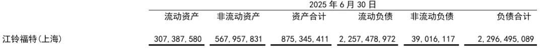 需要注意的是,江铃福特截至2025年6月末的总负债高达22.96亿元,而手中的总资产仅8.75亿元,净资产为-14.21亿元,资产负债率高达262.46%,处于资不抵债状态,持续亏损下经营压力如滚雪球般越滚越大。