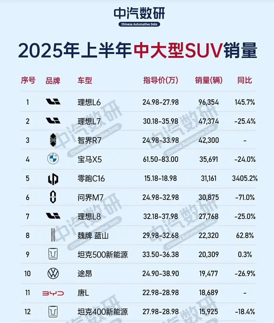 相比之下,不少自主新能源品牌早已通过技术的持续创新实现品牌升维。就拿福特智趣烈马所在的中大型SUV赛道来说,中汽数研数据显示,2025年上半年理想L6、理想L7分别以96354辆和47374辆的总销量摘得细分赛道冠、亚军。