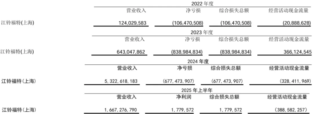 另据江铃汽车财报,江铃福特的收入由2022年的1.24亿元翻倍增长至2024年的53.23亿元,不过过往三年的亏损额度分别为1.06亿元、8.39亿元和6.77亿元,直到2025年上半年,江铃福特的净利润才回正至177.96万元。
